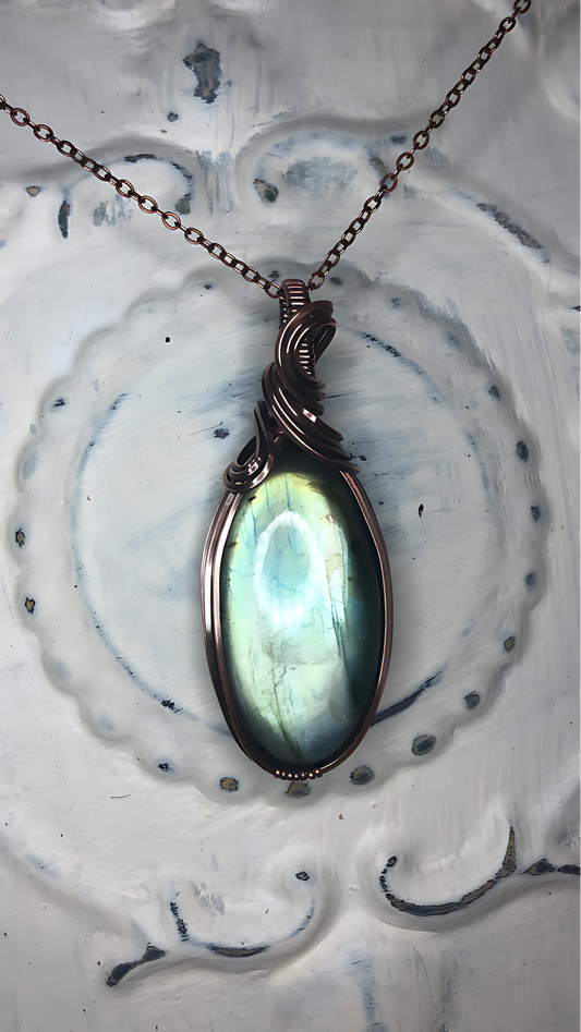 Radiant Light Green Labradorite in Antiqued Copper Necklace